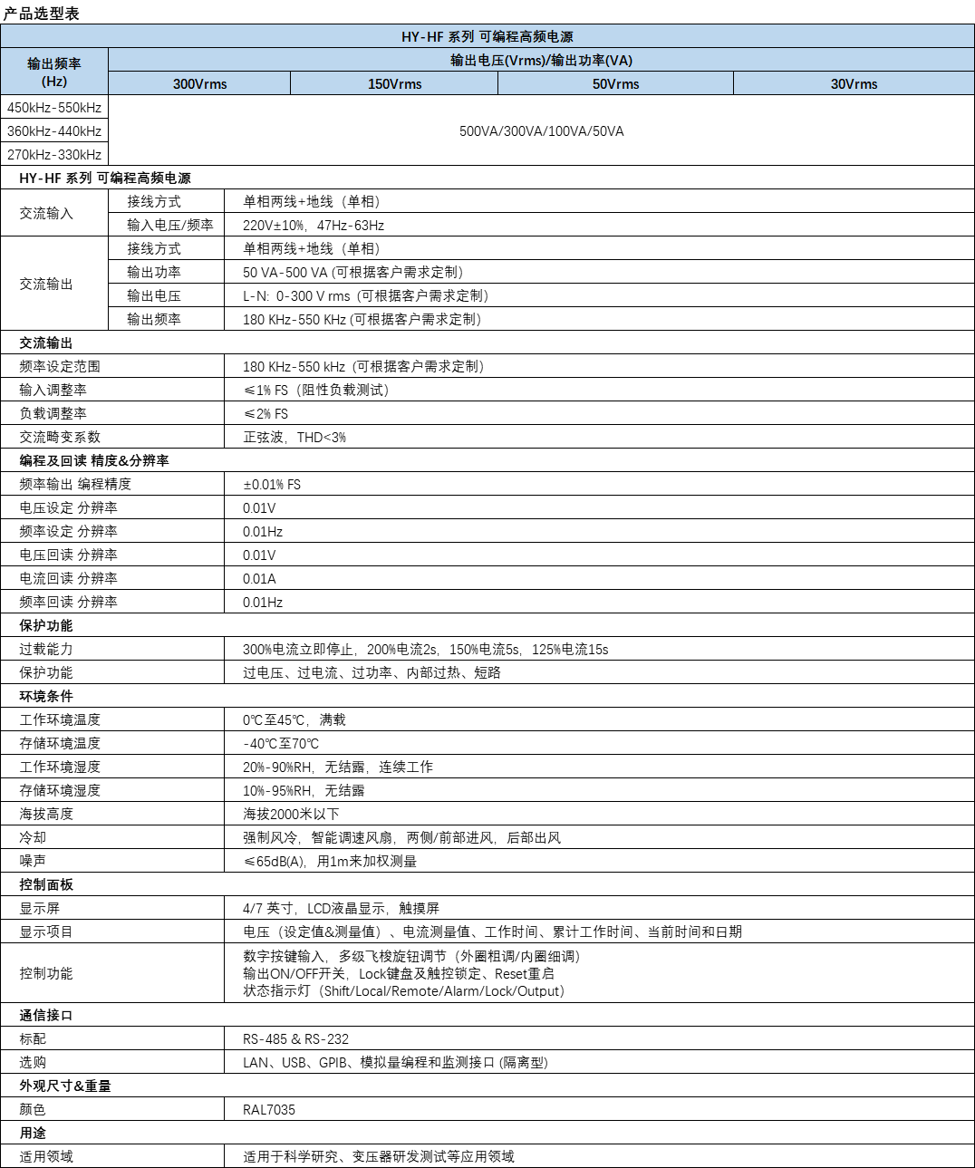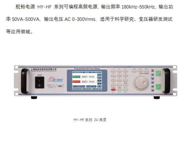 产品详情:航裕电源HY-HF系列可编程高频电源,输出频率180khz-550khz,输出功率50va-500va,输出电压AC0-300Vms,适用于科研,变压器研发测试等应用领域。