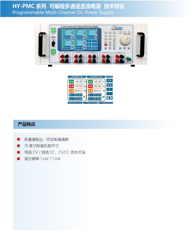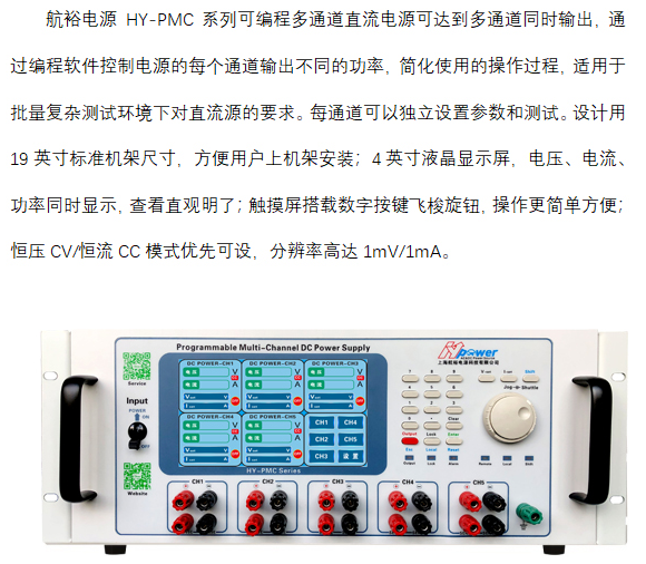 航裕电源HY-PMC系列可编程多通道直流电源可以实现多通道同时输出。电源的每个通道都可以通过编程软件进行控制,以输出不同的功率,从而简化了使用过程,并且适用于批量繁杂的测试环境。要求:每个通道可以单独设立参数并进行测试;恒宇powerHY-PMC系列可编程多通道直流电源可以实现多通道同时输出。电源的每个通道都可以通过编程软件进行控制,以输出不同的功率,从而简化了使用过程,并且适用于批量繁复的测试环境。要求:每个通道可以独立自主设立参数并进行测试;恒宇powerHY-PMC系列可编程多通道直流电源可以实现多通道同时输出。电源的每个通道都可以通过编程软件进行控制,以输出不同的功率,从而简化了使用过程,并且适宜批量繁复的测试环境。要求:每个通道可以单独设立参数并进行测试。