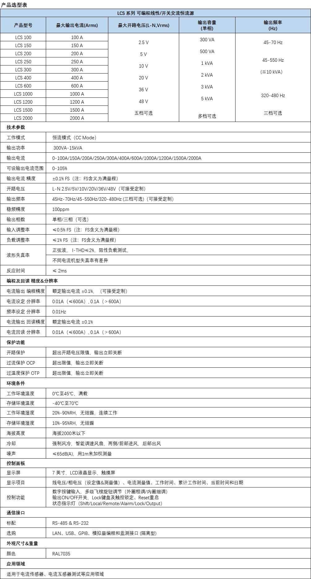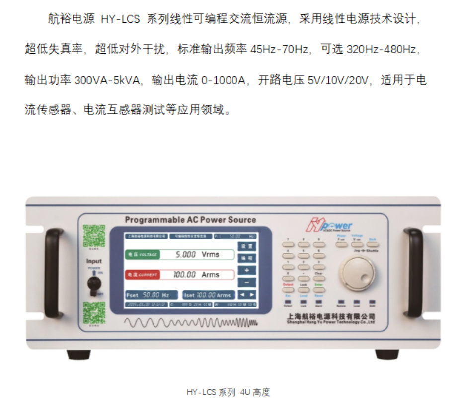 航裕电源HY-LCS系列线性可编程交流恒流源,使用线性功率技术设计,具备超低失真率,超低外部干扰,规范输出频率45hz-70hz,可选320hz-480hz,输出功率300va-5kva。输出电流0-1000A,开路电压5v/10v/20v,适用于电流传感器,电流互感器测试及其他应用领域。