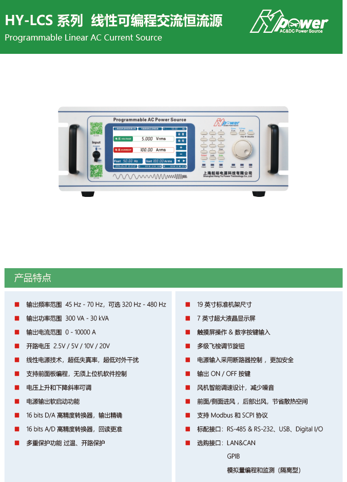 产品详情:简介航裕电源HY-LCS系列线性可编程ac恒流源,使用线性功率技术设计,具备超低失真率,超低外部干扰,规格输出频率45hz-70hz,可选320hz-480hz,输出功率300va-5kva。输出电流0-1000A,开路电压5v/10v/20v,适用于电流传感器,电流互感器测试及其他应用领域。