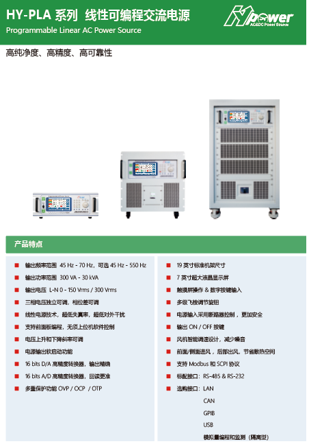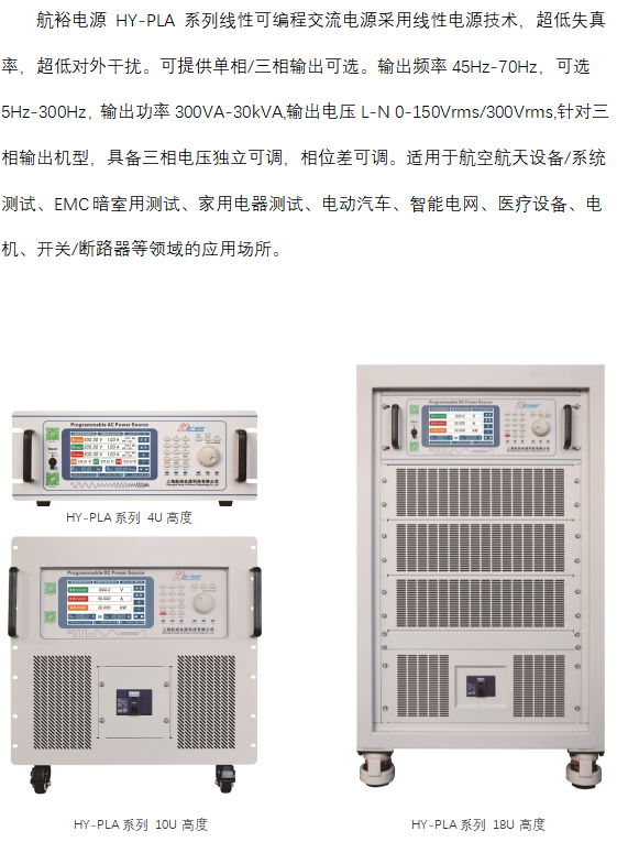 航裕电源HY-PLA系列线性可编程交流电源使用线性电源技术,失真率极低,外部干扰极低。可提供单相/三相输出可选。